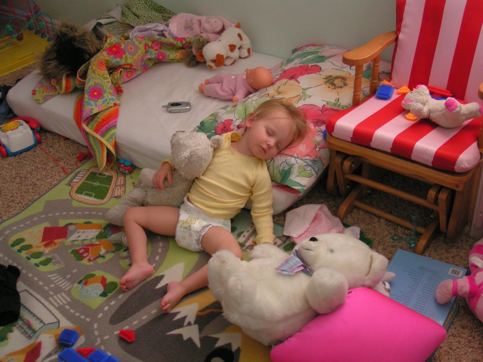 Pearl loves to destroy her room every day during nap time. She pulls out all her toys, books, stuffed animals and plays with them and then usually crashes right in the middle of them.